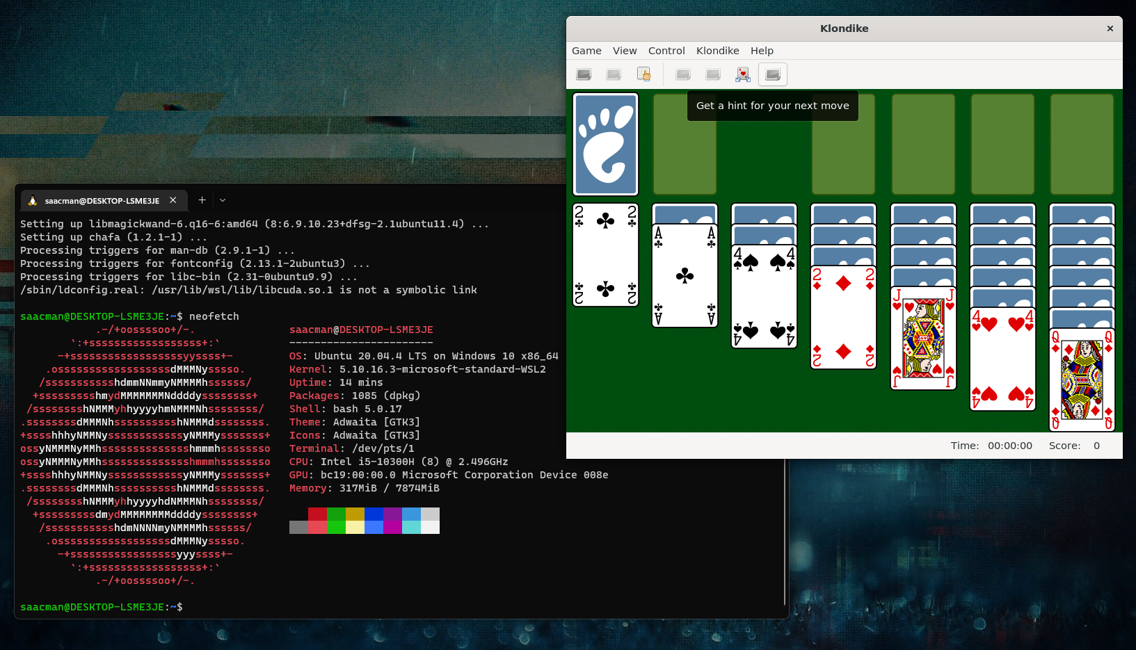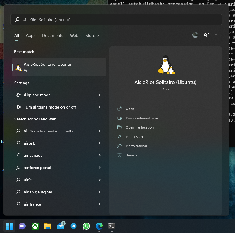 Windows 11 uses WSLg to enable support for running GUI apps on Windows in a fully integrated desktop experience. For example, we can install AisleRiot using the command: