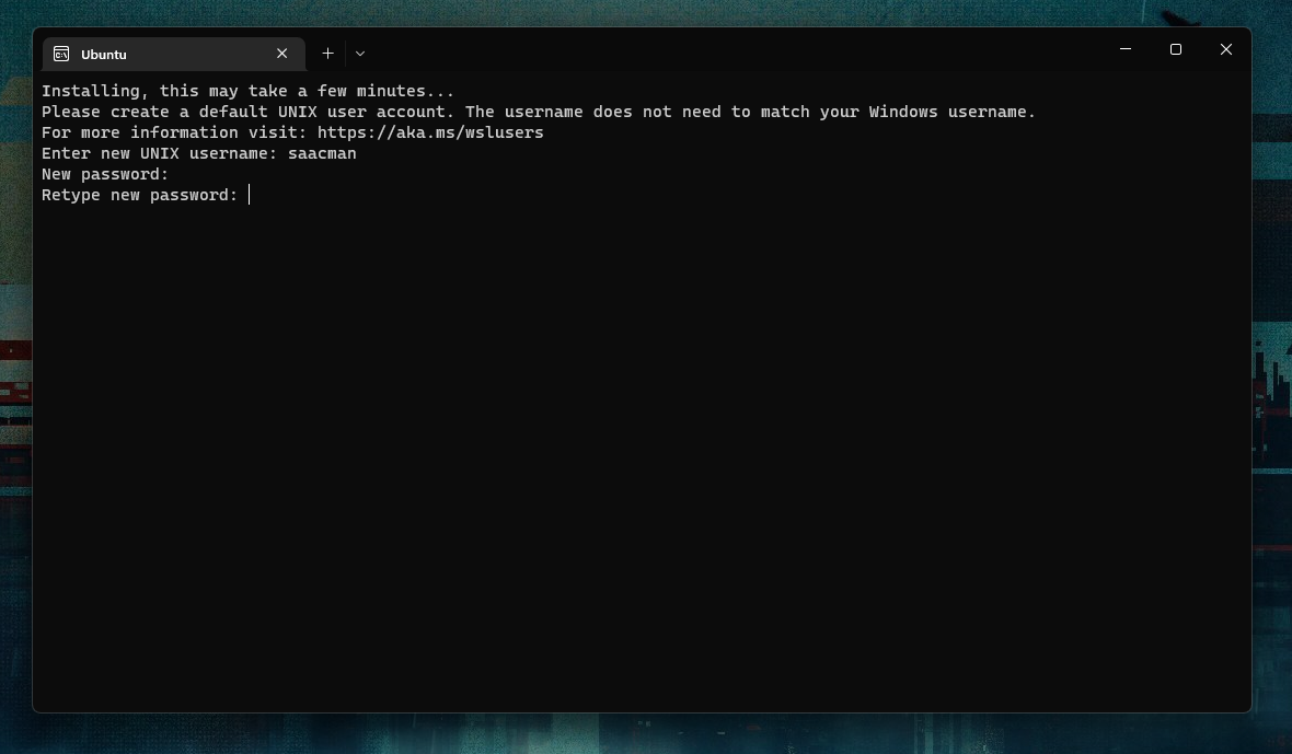 After a few minutes, a prompt will ask for a username and a password. This user and password are exclusive for Ubuntu, and are not related to the Windows ones.